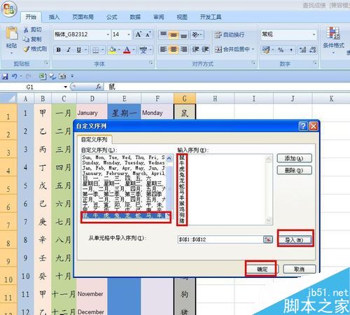 还有一些我们常用的序号,在EXCEL中没有办法直接输入,我们可以通过自定义来实现,在G列中输入鼠、牛……,选定单元格,单击OFFICE——EXCEL选项——常用——编辑自定义列表,单击弹出对话框,点击导入,可以看到我们导入的序列,点击确定。