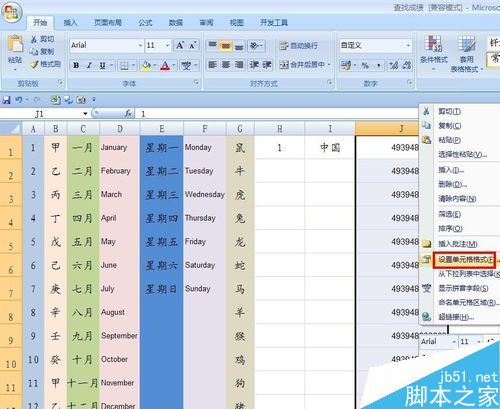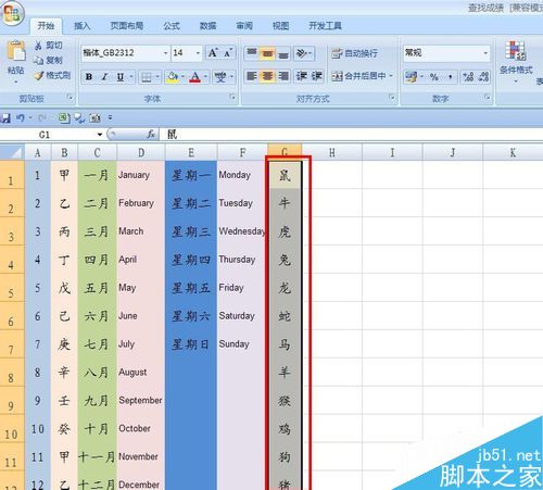 这时候我们在原来的工作表中试试,在G1、G2中分别输入鼠、牛,向下拉填充手柄,看看效果,是不是得到我们要的效果了。
