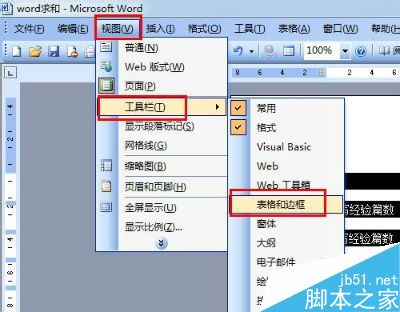 1、因为是对表格的数据进行统计,所以我们要先调用出表格和边框工具,word2003默认是不显示的,如图,点击选择视图菜单下工具栏下的表格和边框工具,就可以调用出来了。