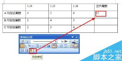 2、如图,word表格中我们要对单元格左方的数据求和时,那么就将鼠标光标移动到需要显示求的数据的单元格,然后点击表格和边框工具中的求和按钮,就可以计算左边数据的总和了。如果数据在上方,那么就是总和上方的数据,上方的数据优先。