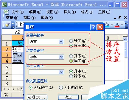 主要关键字是语文,次要关键字是数学,都是降序!