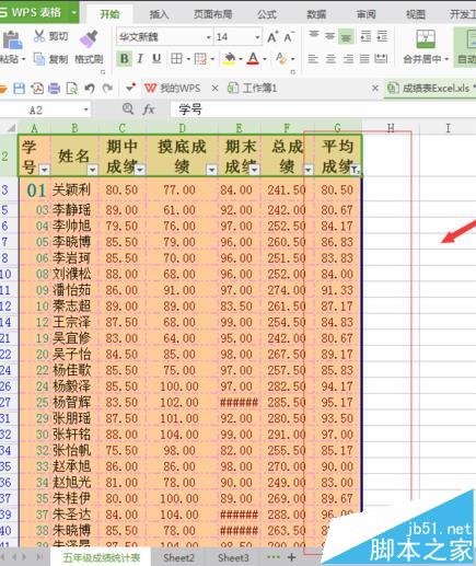 4、这个时候,筛选就完成了,如图,都是按照平均成绩筛选出的大于等于80的学生