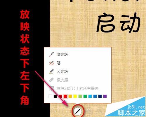 3、点击画笔工具后浮出一个选项卡,有三种画笔类型,有颜色格子还有不可少的橡皮擦。激光笔只有红色,它是空心圆的形状,效果就跟拿着激光笔对着PPT的大屏幕划来划去差不多,下图是激光笔效果呈现。