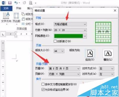 5、在稿纸设置对话窗口中,将网格下的格式选为“方格式稿纸”,然后再设置下方的页面以及页眉/页脚,最后在点击“确定”按钮。