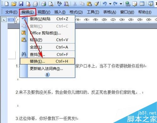 2、在菜单栏里单击“编辑”,在下拉菜单中选择“替换”