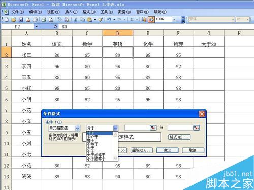 4、单击“介于”后方的小倒三角形会下拉很多选项,在下拉的选项里我们单击“大于”按钮。