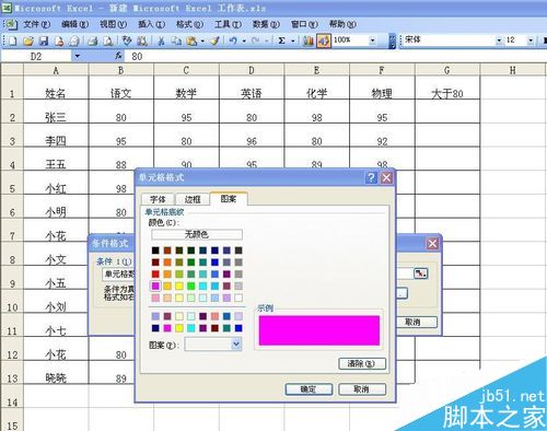6、单击“格式”按钮后会弹出如图对话框,这时我们单击“图案”按钮,然后选择填充颜色红色,如图2.