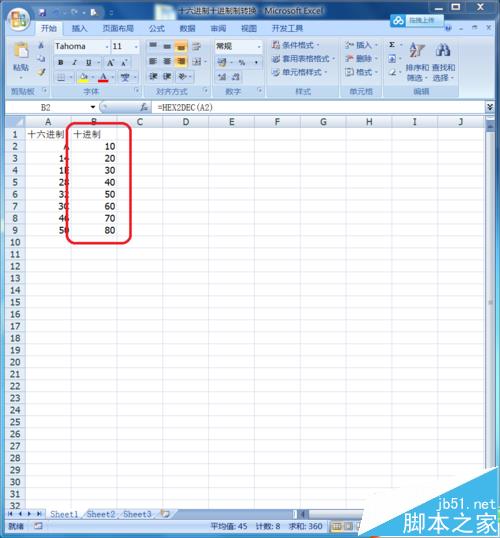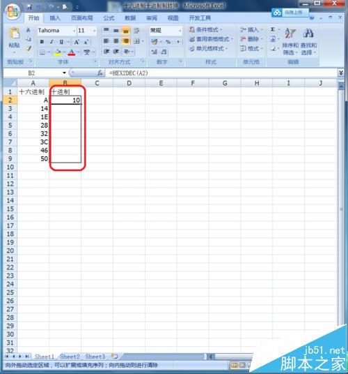 3、在要生成的表格中输入函数“=HEX2DEC(*)”。(*代表要转换的那个单元格或者十六进制数),有图可到A的十进制数为10。