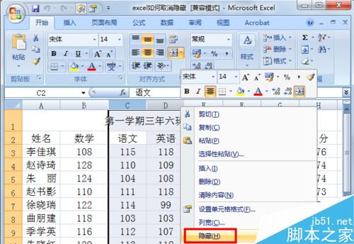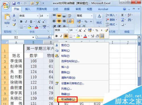 2、在被选中的单元格中右键单击,选择取消隐藏。