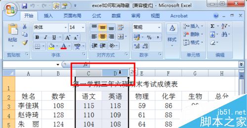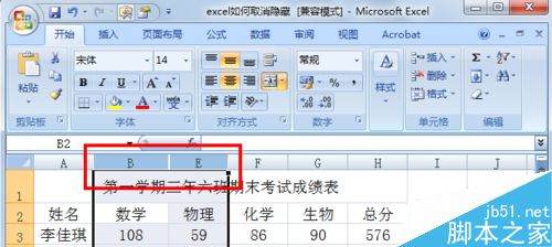 3、这时就会发现C、D两列被隐藏看不见了,隐藏行的方法和隐藏列类似。