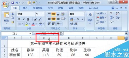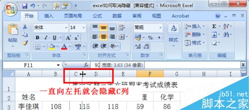 2、托的过程中就会看见D列显示出来了,用同样方法把C列也托出来。