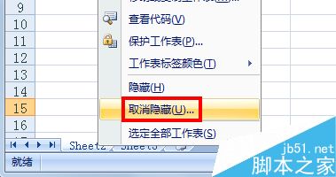 3、在下面其中一个工作表上右击,选择取消隐藏。