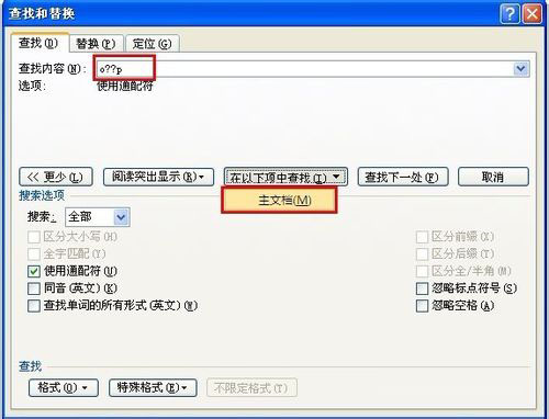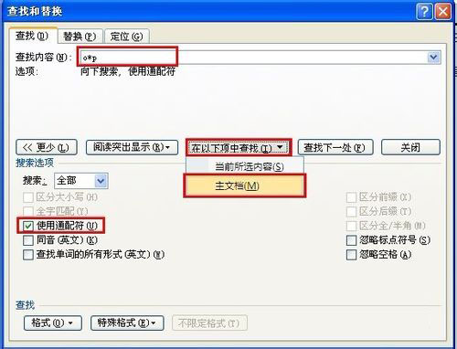 在查找内容中输入o*p,然后勾选“使用通配符”后,在“在以下项中查找”下拉列表中选择“主文档”: