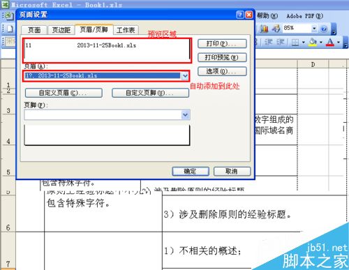 3、我们可以在页面设置对话框中看到预览情况,并且设置自动添加到“页眉”下拉菜单中,以便下次使用同样设置,直接打开选中即可。