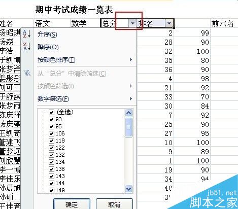 10、同样按照这个方式我们可以语文,数学等选项依次进行排序,基本的筛选功能就是这么使用,原理相同,实际按照你需要处理的数据为准。