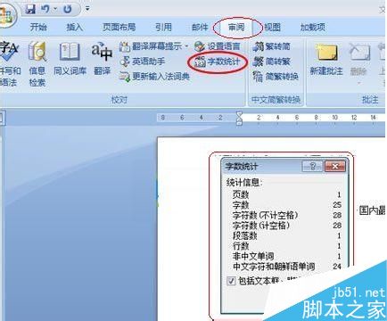 word 2007字数统计在审阅菜单下的——校对——字数统计里面,如下图所示。