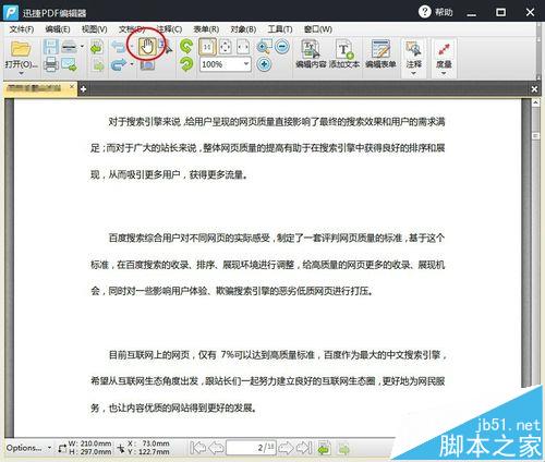 1、用编辑器打开PDF文档,默认已选择手型工具,可对文档内容查看浏览,无法输入、编辑修改文档。