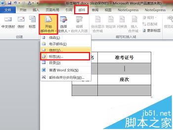 2、打开工具栏中的“邮件”选项卡,找到“开始邮件合并”,选中下拉菜单中的“标签”。