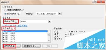 3、点击“标签”后进入“标签选项”窗口,选中自己所需要的标签供应商及产品编号,在本例中我使用A4纸打印,所以我选择A-ONE(标签供应商)中的A-ONE 26501(产品编号),同时也可以点击“详细信息”或者“新建标签”对选中的标签信息进行进一步调整。