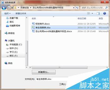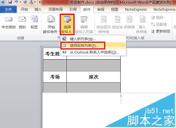 6、找到“邮件”中的“选择收件人”,点击下拉菜单中的“使用现有列表”,选择数据源文件“考生信息表”,打开。