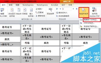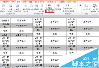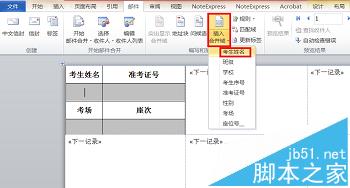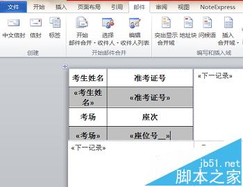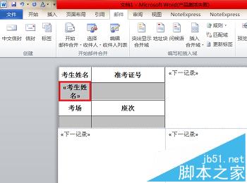 8、可以看到每个标签都包含“《下一记录》”这样一个域,接下来插入合并域,先将光标移动到考生姓名下的编辑框内,点击“插入合并域”下拉菜单中的“考生姓名”,我们看到考生姓名下的编辑框内已经插入了考生姓名域。