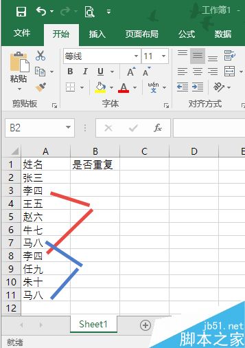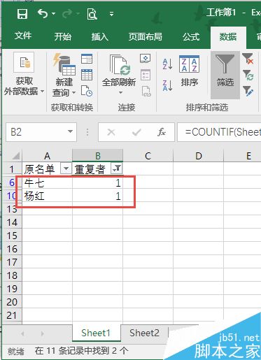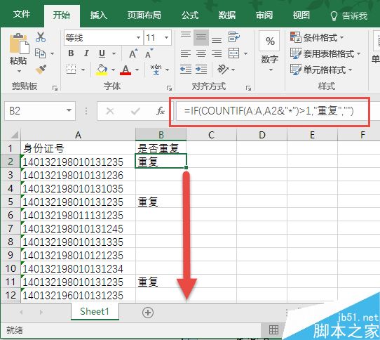 我们在表Sheet1的B列设置一列判断重复,定位到表Sheet1的B2单元格,输入如下公式: