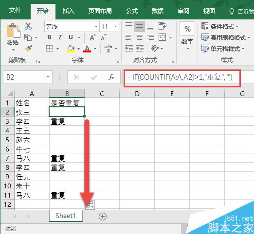 现在,用一个小公式即可搞定。创建一个辅助列B,用来存放判断重复的标志,若有重复就标“重复”,不重复就什么也不标。在B2单元格中输入公式并回车: