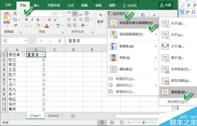 为了使重复的项目看起来更显眼,我们还可以给重复的项目加上颜色。通过“开始→条件格式→突出显示单元格规则→重复值”路径进行设置。