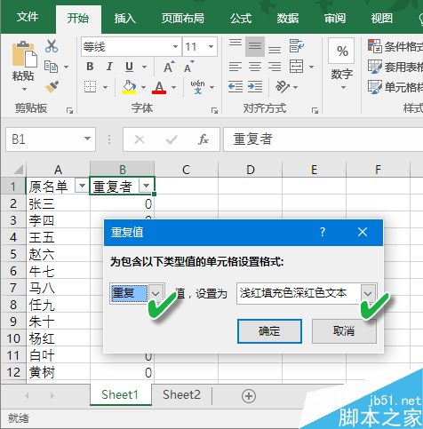 在“重复值”对话框中,给“重复”值设置某种填充色和文字颜色,然后确定。