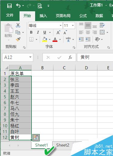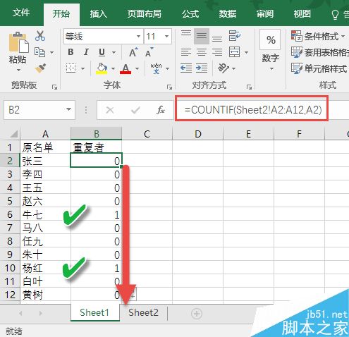 回车之后用该单元格右下角的填充柄向下填充到该列最后,可以看到所有标示为1的即是两表中重复出现的人名。