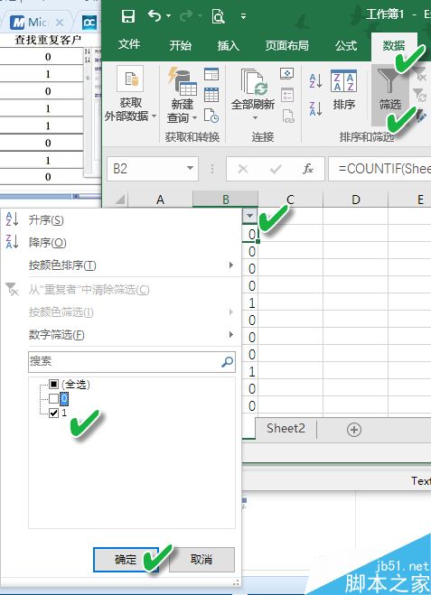 由于我们对不重复的项并不关心,它们会干扰我们的视线,因此需要将不重复的项目屏蔽掉。通过“数据→筛选”命令,点击筛选框的小三角进行筛选设置,选择值为1的项目进行筛选。