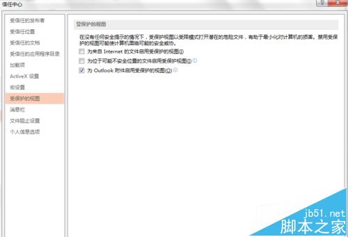 4、信任中心设置,受保护的视图,然后将前面两个勾去掉即可 ;