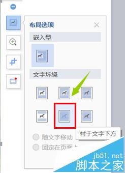 3、点击该图标,然后选择布局形式为"衬于文字下方",如图;如果插入时图片没有布满文档,我们可以通过拉动实现全覆盖;