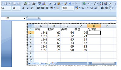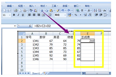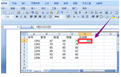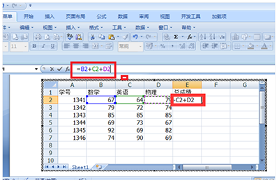 2、将鼠标移动到需要计算得到的表格中,然后直接在上方输入你需要的公式,比如加法 =B2+C2+D2。