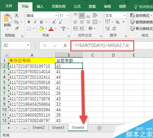 解释:其中YEAR(TODAY())代表今年,MID(A1,7,4)取身份证中的年份,两个相减就是年龄。