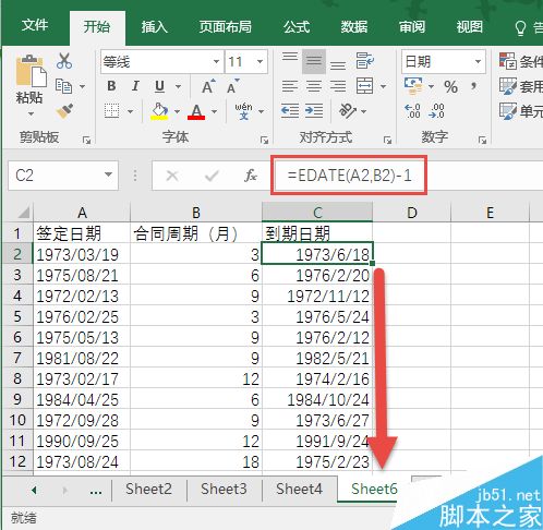 在如下图所示的C2单元格中输入上述公式并用填充柄填充C列,即可自动获得到合同的到期日期。