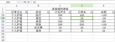 6、这时,你会发现表格里只显示日常支出中个人护理这一栏。这样就在繁多的项目里找到了你需要的项目。起到筛选的作用。