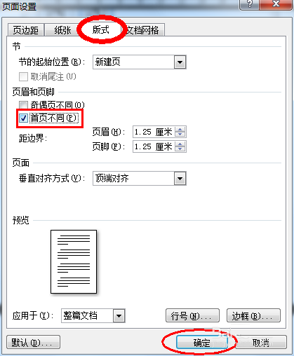3、如果你还设计有封面,封面肯定不想让显示页码了,同样按照第一步页面布局→页面设置(弹出图二的窗口)→版式→选择首页不同→确定。然后首页没有页码显示了,但是第二页的页码却是从2开始的,这就需要在设置页码格式了。