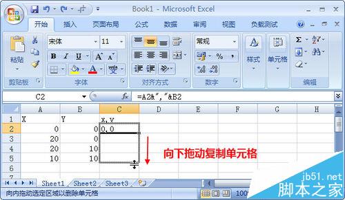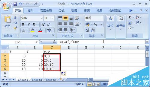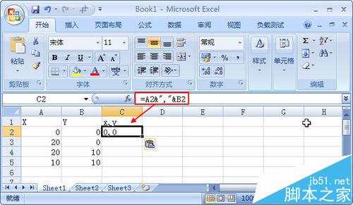 2、当然我们也可以直接将坐标输入按x,y格式输入到一行里,但用属性提取EATTEXT等或其他工具获取的坐标值通常是将XY坐标分开为两列的,这些书写主要是为了教一下大家如何将分开的XY坐标合并成x,y的形式。单击X,Y列的第一个空单元格,也就是上图中的单元格C2,在顶部fx公式栏输入公式=A2&","&B2,就可以将XY坐标合并成需要的格式了,如下图所示。