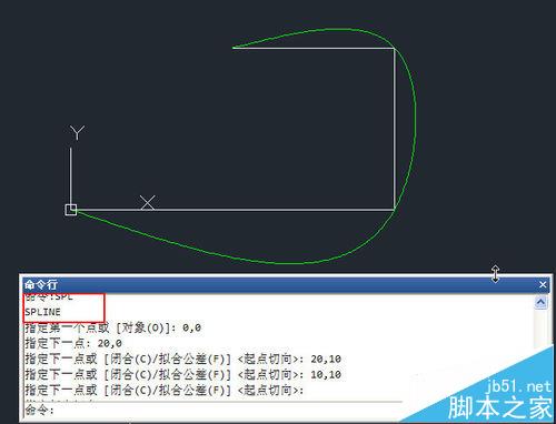 7、上面只是为了练习功能,输入了几个简单的坐标并绘制了简单的直线,在实际工作中,我们的EXCEL表格中可以有上百个点的坐标,而且可以在执行多段线PL或样条曲线SPL后粘贴坐标来绘制复杂的曲线。假如我们执行SPL命令后仍粘贴上面的坐标,就会得到一条如下图所示的样条曲线。