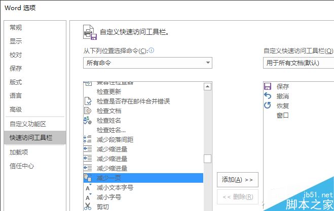 在Word 2016中,进入“文件→选项”打开选项对话框,选中左侧“快速访问工具栏”,再将“常用命令”设置为“所有命令”,然后在列表中找出“减少一页”项,点击“添加”将其加到快速访问工具栏中,当再需要快速缩页时,点击一些此按钮即可达到缩减一页的目的,而且版面没有太大变化。