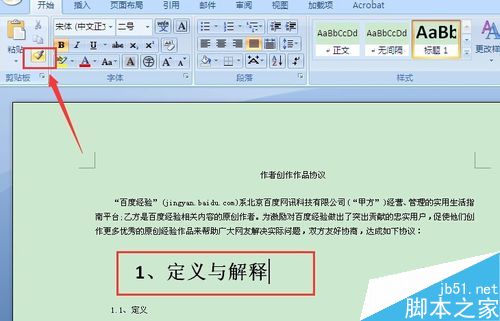 3、这样可以看到刚才光标放在那一行的大标题文字变了,然后就可以双击一下开始选项页面左边的“格式刷”(记得双击格式刷前要点击选中样式如标题1):