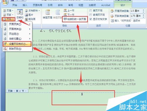 10、然后双击页脚那里,去掉上面的“链接到前一条页眉”选项,并且点击左边里的“页码”,看到有个“设置页码格式”选项,点击: