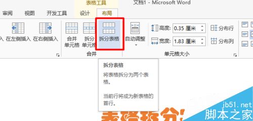 切换到“布局”功能区,点击“拆分表格”按钮,就可以将一个表格拆分成两个表格。