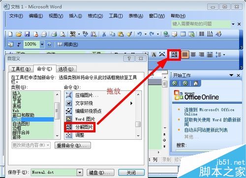 4、将【分解图片】拖放到工具栏的适当位置。这样准备工作就做完了!