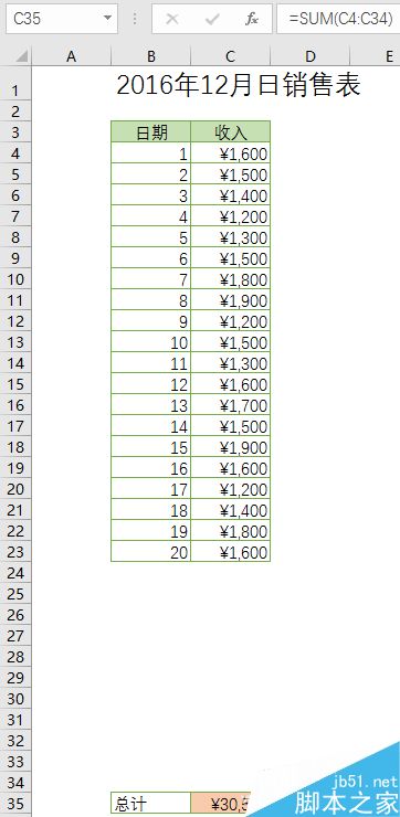 现在要制作的是一个日报表的Excel表格,月份按最大31天计算留出空档,从C4到C34单元格。第C35单元格为汇总数值,其中输入的计算公式为“=SUM(C4:C34)”。如此一来,每天的销售额只需要直接输入进去,汇总的数值就会实时改变。