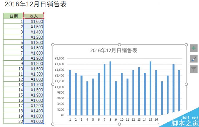 不过此时会发现一个问题,当增加数据后,虽然图表标题实时改变,而已经生成的图表却没有更新。解决方法很简单,首先选中图标,这时数据区相关的数据也呈现选中状态。