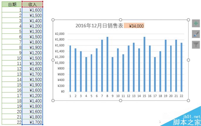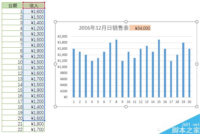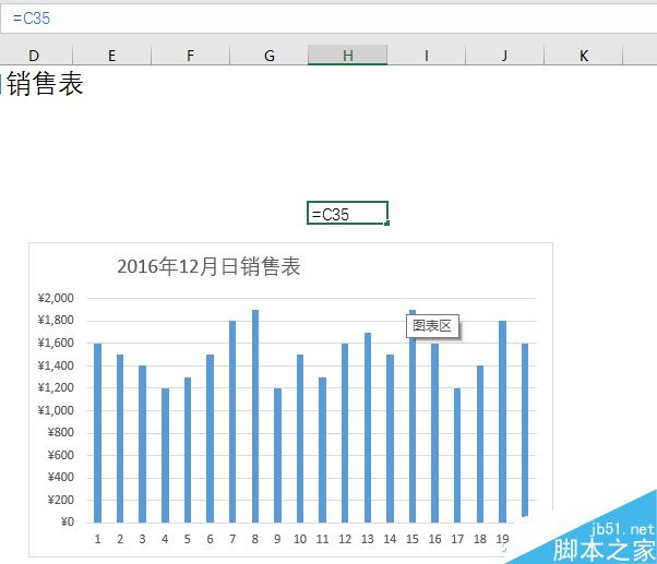 接下来移动图表,使得标题文字与上一步中设置的引用C35的单元格对齐,一个动态的图表标题就完成了。现在当我们输入新的日销售额的时候,图表标题中的汇总数字