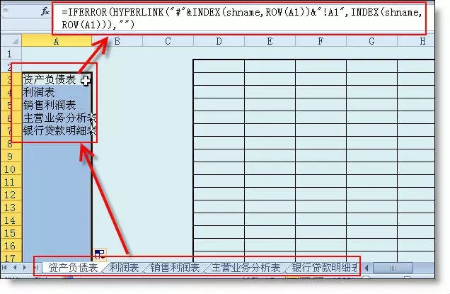 先来个效果演示:可以点A列的目录快速跳转到指定的工作表。