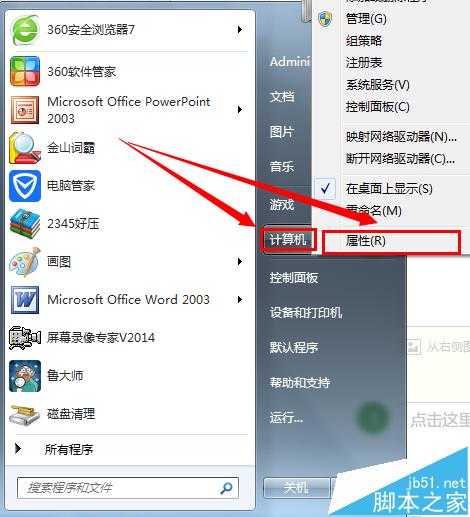 2、点击开始菜单,右点击“计算机”,选择属性;